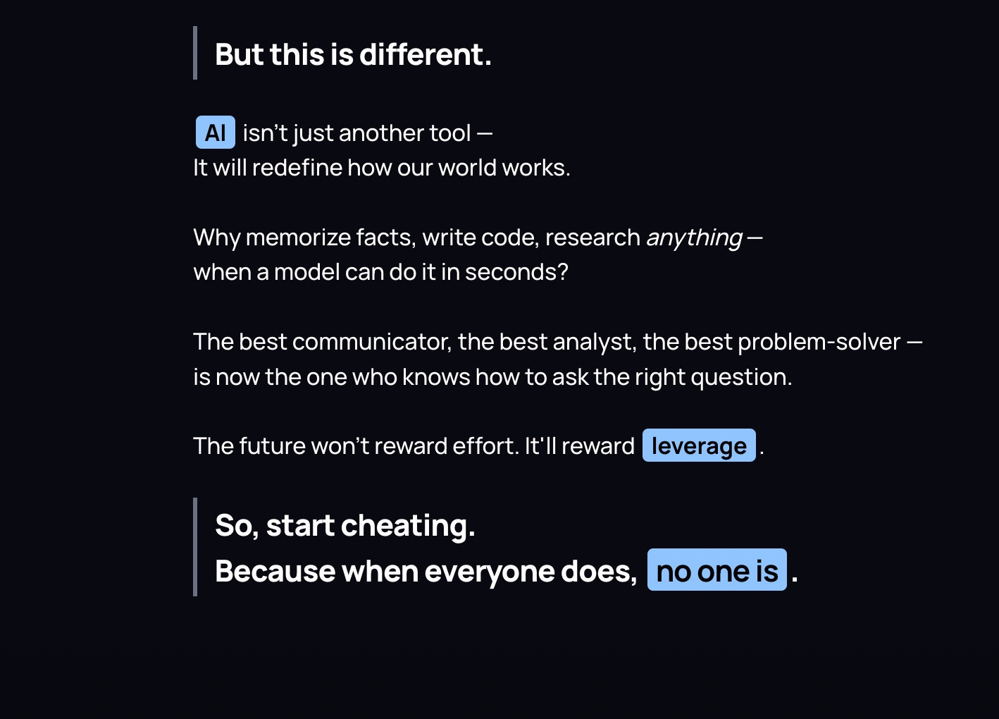 Indiscriminate use of A.I. will appeal to the transactionalists—if all that matters is piling up credits for the degree at the end of the rainbow, why not make use of this new tech? Especially when its advocates loudly declare that anybody who doesn’t get used to using A.I. is going to be left behind. Or as the advertising for the A.I. app Cluely claims: if everybody’s cheating, nobody is.