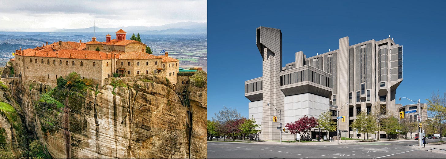 Libraries are all connected, as anybody first discovering the joy of inter-library loan will attest. More abstractly, libraries are connected by their common project of collecting, protecting, and sharing knowledge. This fact of their connection, of the permeability of their collections and the information gathered therein, may seem at odds with the tendency of physical libraries to often look or feel like redoubts, fortified spaces built up around their collections to protect the books within. When I did my master’s degree at the University of Toronto, the Robarts Library was somewhere I spent countless hours; approached from outside, it appears a formidable and vaguely castle-like building. Such indeed was the nature of many medieval libraries, which were often housed in monasteries—themselves fortified and built in inaccessible locations to discourage raiders. In a present moment when information is all-pervasive and inescapable, when books are cheap and plentiful (even without considering their digital versions), it can be an effort to grasp how rare and thus precious books were in the Middle Ages. The libraries guarded in fortified monasteries were like bank vaults hoarding civilizational treasure, and yet that information and knowledge still circulated, laboriously copied out in scriptoria and carried in the minds of scholars.