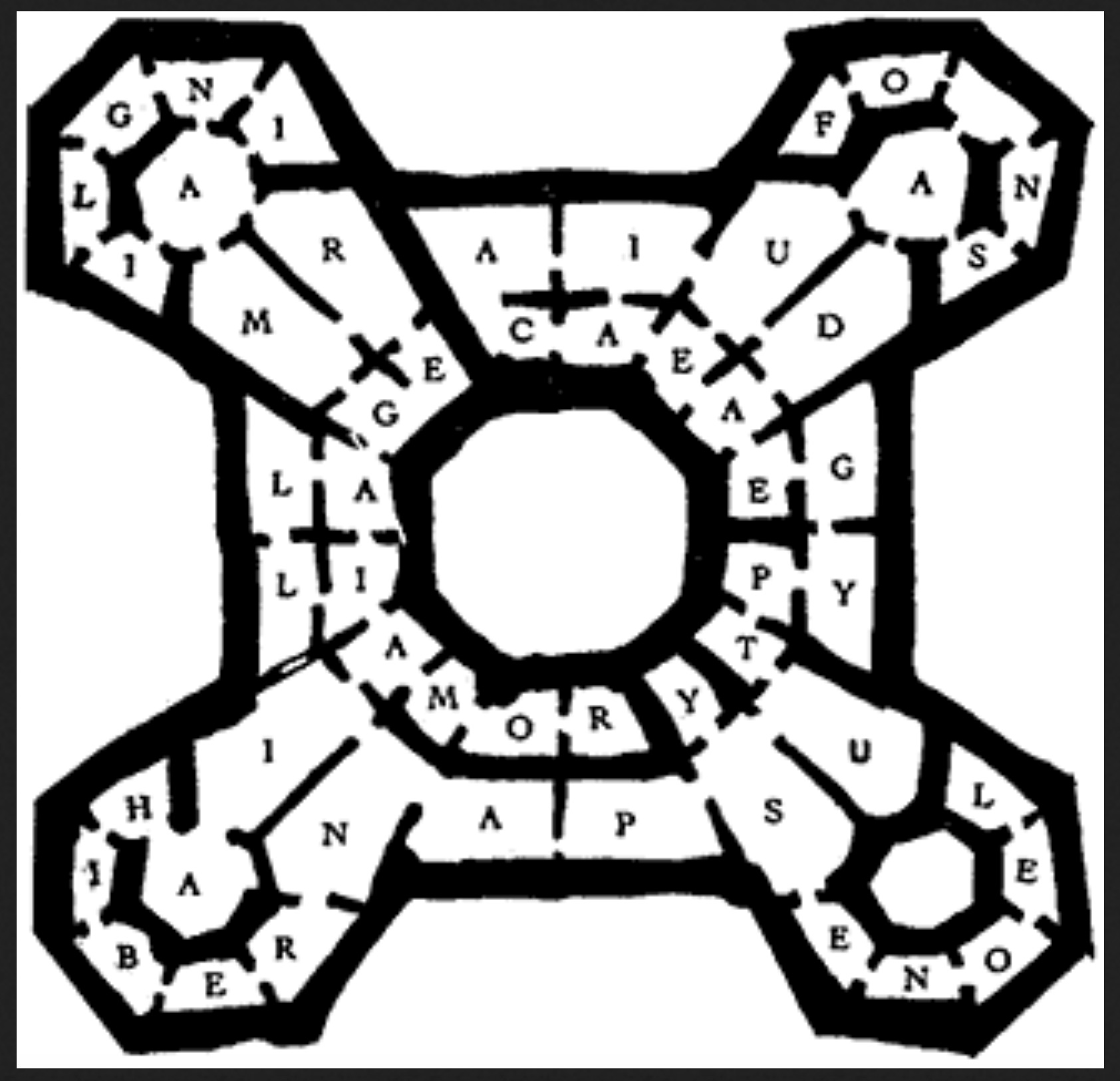 These two paradigms of the labyrinth are symbolic in distinct ways. The unicursal labyrinth, with its winding but singular path, represents fate—the many twists and turns of one’s life leading inevitably to one place. The multicursal labyrinth by contrast is about the navigation of confusing choices and the resolution of riddles.6 The former is existential, the latter epistemological; part of Dobb’s argument, however, is that on the metaphorical level this is a distinction without a difference.7 The apparent indifference to these contradictory paradigms, she suggests, reflects a subtler understanding of the labyrinth, an understanding that doesn’t see a contradiction but rather that fate and choice coexist.