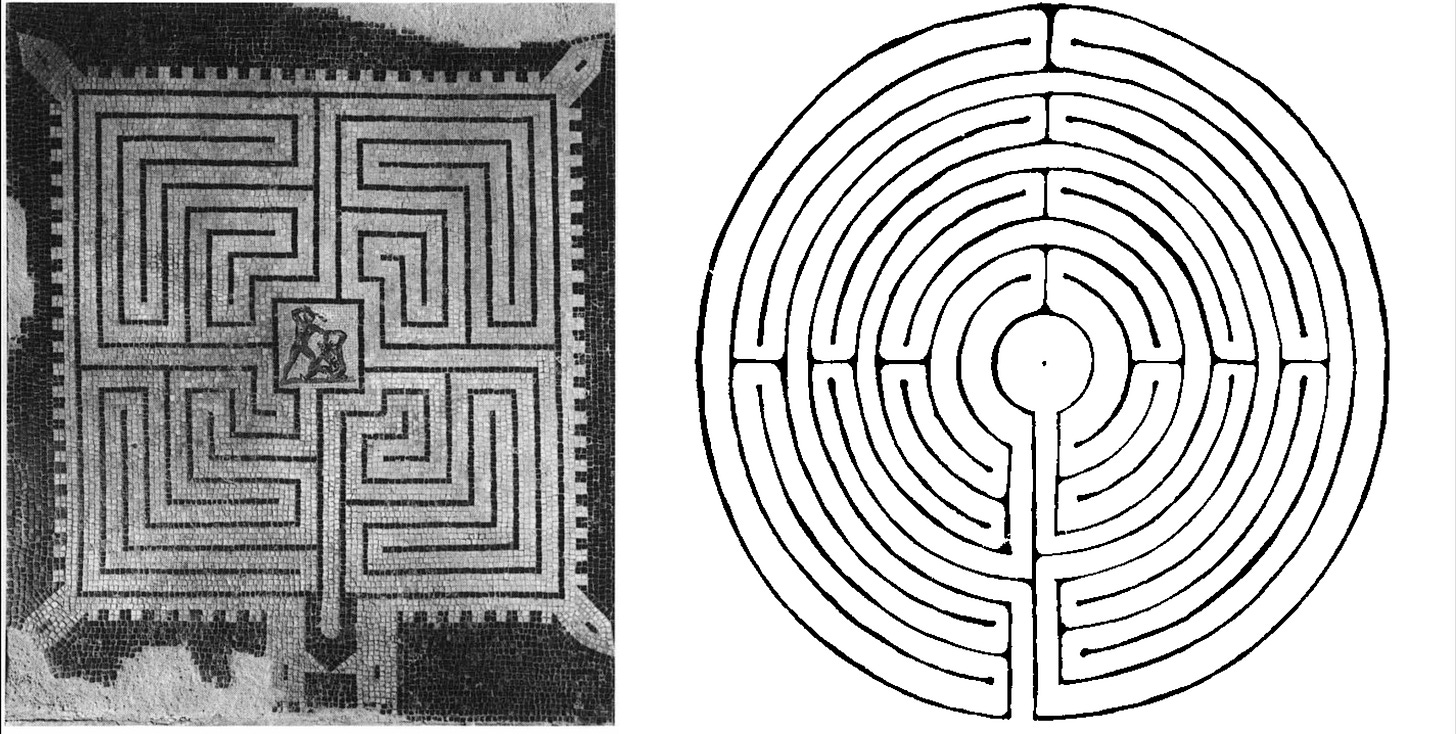 The fact that Theseus needs a thread to find his way back out of the labyrinth tells us that it is a maze, i.e. a series of corridors with many turns and forks and dead ends, designed to make those entering get lost—the kind of thing decorating the back of cereal boxes or kids’ placemats at some restaurants. It is, to use the technical term, “multicursal.” This however is at odds with depictions of the labyrinth in ancient Greek and Roman art. The “classical” labyrinth is, as Penelope Reed Doob notes in The Idea of the Labyrinth (1990), “unicursal”—a single path that winds back and forth on itself endlessly, arriving either at a central point or ultimately exiting elsewhere. Which would be tiresome and arduous to traverse, but impossible to get lost in so long as you always move forward.